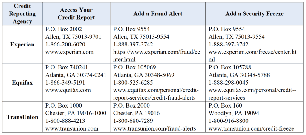Contact Information: Below is the contact information for the three national credit reporting agencies (Experian, Equifax, and TransUnion) if you would like to add a fraud alert or credit freeze to your credit report.